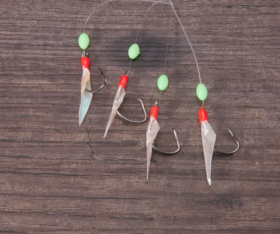 Dieses Heringsvorfach gibt es mit drei unterschiedlichen Hakengrößen. Es besitzt vier Circle Hooks, welche mit echter Fischhaut bestückt sind. Es gibt das Vorfach in der Hakengröße 8, 6 und 4.