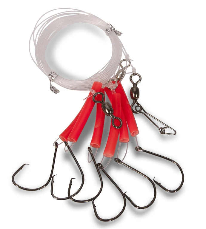 Ein ca. 6,00 m langes Rotbarsch-System mit 6 Circle Hooks gebunden an Monofilschnur. Damit können Rotbarsch-Schwärme optimal befischt werden und der Fluo-Schlauch erzeugt zusätzliche Lockwirkung. In der Mitte ist das Vorfach durch einen weiteren Wirbel getrennt, dieser beugt Verwicklungen vor. Verfügbar ist dieses Vorfach in den Farben flu rot und fluo grün, sowie mit Circle Hook Haken der Größe 6/0 oder 8/0.