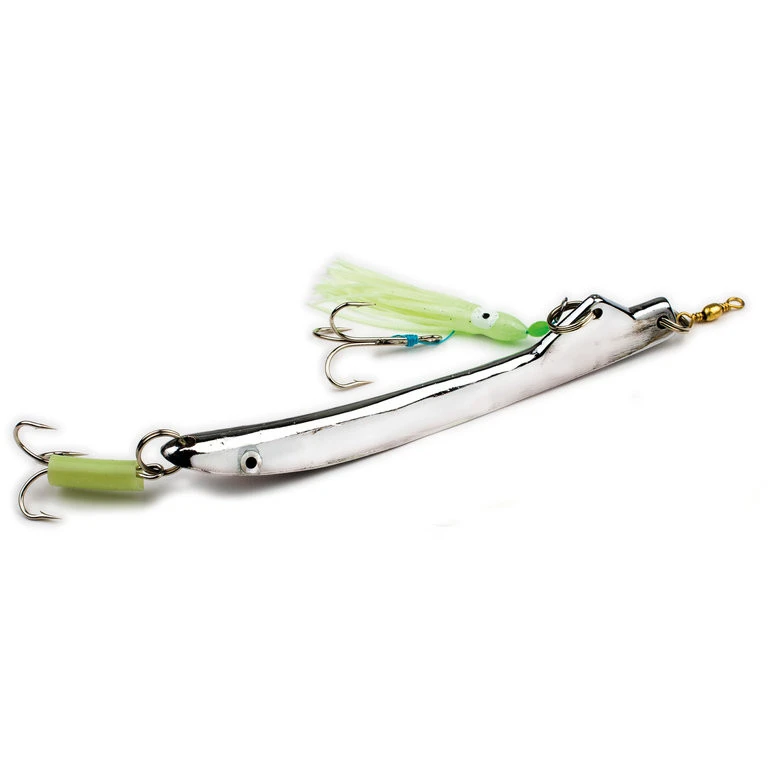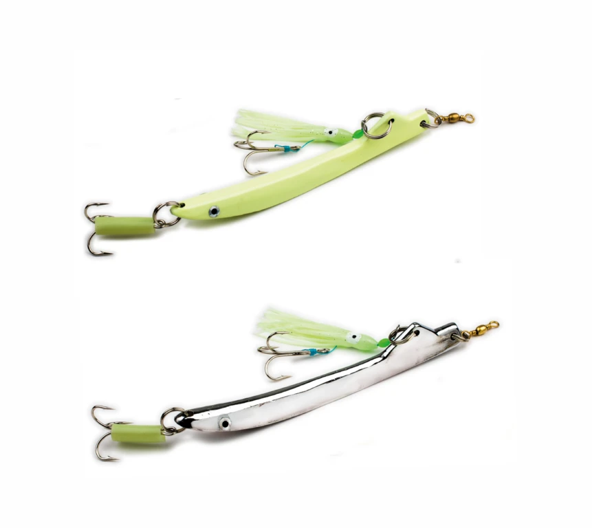 Dieser Pilker in der traditionenllen Bananenform wurde zusätzlich mit einem Octopus ausgestattet, um die Lockwirkung zu erhöhen und auch Überbeiser sicher zu haken. Der Octopus ist selbstleuchten und mit einem starken Drilling ausgestattet, welcher an einer starken Dacronschnur befestigt ist. Diesen Taumelpilker gibt es in Gewichten von 100g bis 400g. Er kommt dort zum Einsatz, wo in großen Tiefen oder trüben Wasser gefischt wird.