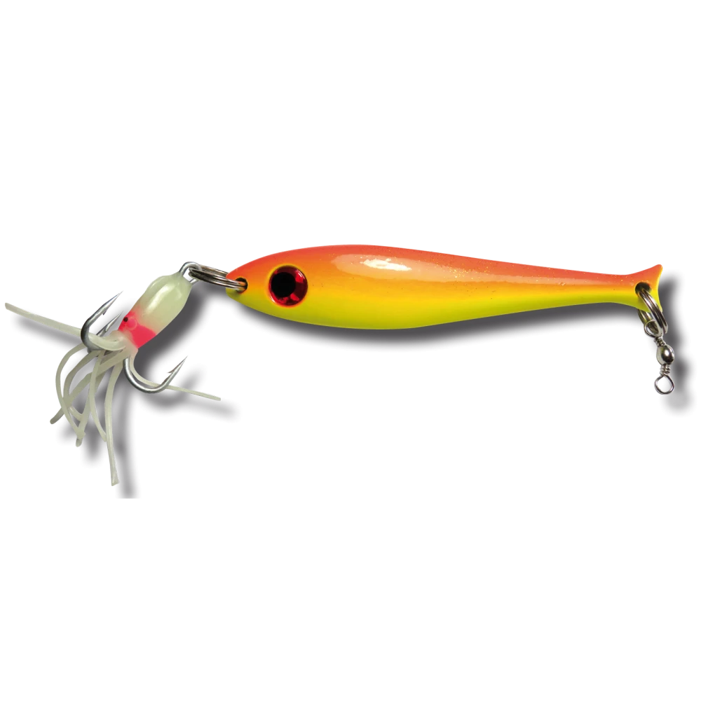 Dieser Pilker besitzt extra große Augen im 3D Design. Die Farbe ist Gelb-Orangen und damit in einem sehr fängigen Muster. Er ist mit feinem Glitter überzogen, hat ein wellenförmiges Gesamtdesign und am Haken einen selbstleuchtenden Oktopus. Verfügbar ist der Pilker in Gewichten von 100g, 200g, 300g, 400g und 500g.