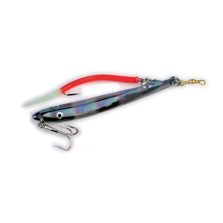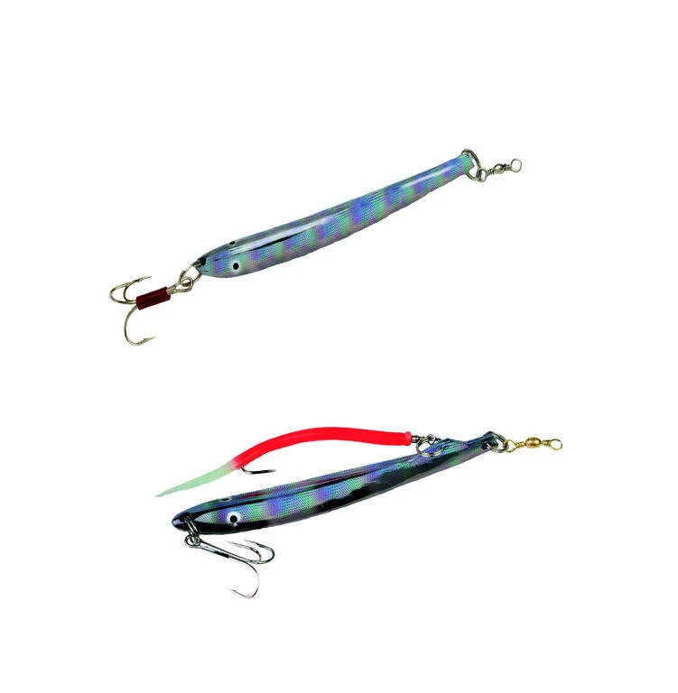 Dieser Bananen-Pilker ist mit einer holografischen Folie überzogen, die beim Absinken in die Tiefe durch den Lichteinfall und Drehung für unwiderstehliche Lockreize sorgt. DEr Pilker ist in Gewichten von 100g bis 400g verfügbar. Es gibt die Ausführungen mit oder ohne Makk-Beihänger.