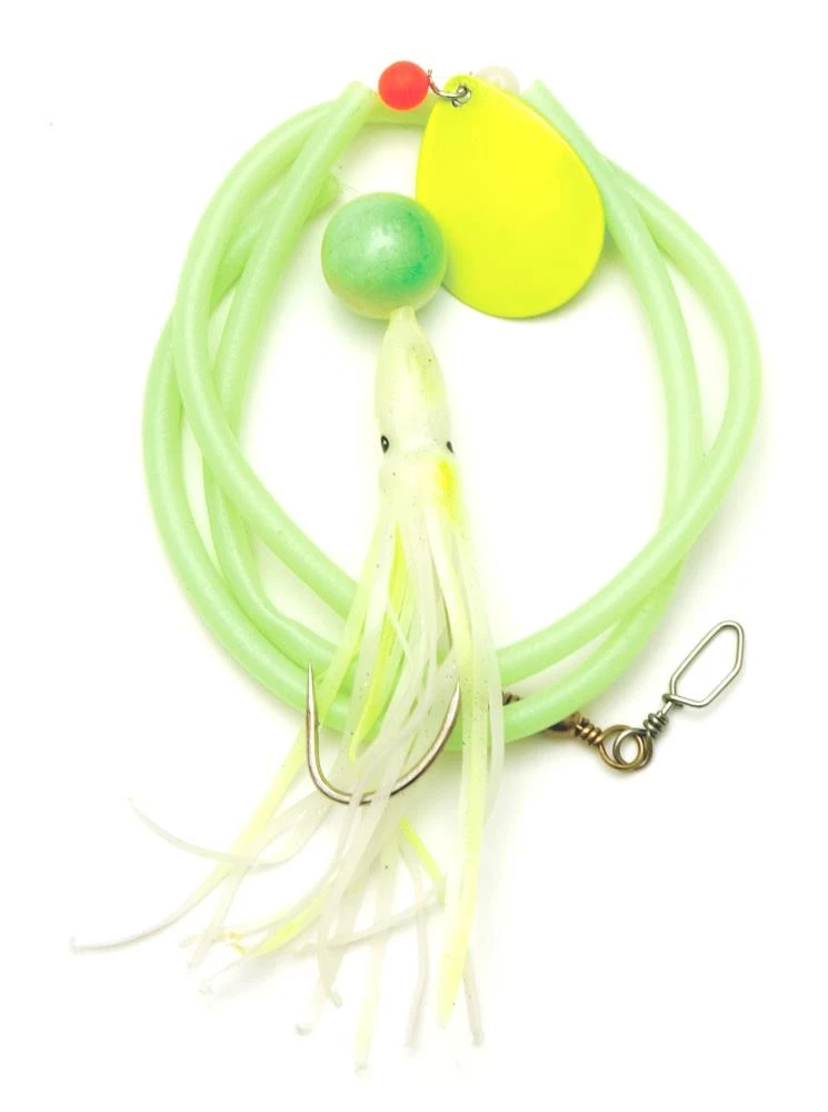 Dieses Naturködervorfach besitzt einen Haken der Größe 10/0 mit einem Fluo-Oktopus. Weiter sind ein Spinnerblatt, eine Perle und Leuchtschlauch verbaut. Die Länge beträgt 80cm bei einer Schnurstärke von 0,75mm.