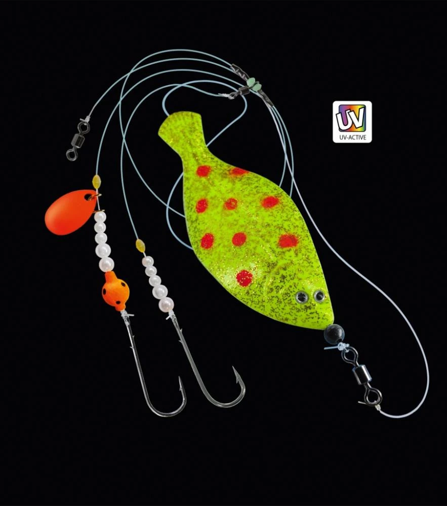 Dieser UV-aktive Inline-Butt-Löffel in Schollen-Form ist ideal zum Plattfisch- und Meeresangeln. Am Löffel ist ein komplett fertiges Vorfach mit zwei Haken (Wirbel, Haken, Spinnerblättchen, Schnur sowie Leuchtperlen) bereits montiert. Die unterschiedlichen Farbvarianten sind UV-aktiv und erhöhen in Verbindung mit den Leuchtperlen den Lockreiz.