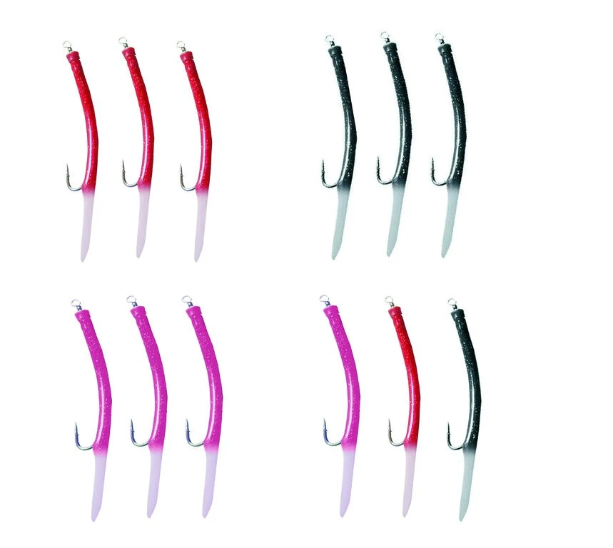 Diese selbstleuchtenden Gummi-Makks besitzen stabile Makk-Haken. Der Leuchtschlauch überzieht diesen gebogenen Haken und ist mit einem Karabiner-Wirbel bestückt. Die Makk sind zweifarbig mit Glitter und einem Leuchtende. Es gibt diese Makks in drei Farben und einen Mix. Die Hakengrößen reichen von 4/0 bis 12/0. In jeder Packung sind 3 gleichfarbige Makks enthalten (außer 12/0 – 2 Stück). Beim Mix ist von jeder Farbe ein Makk enthalten (außer 12/0 – 1x Schwarz + 1x Rot).
