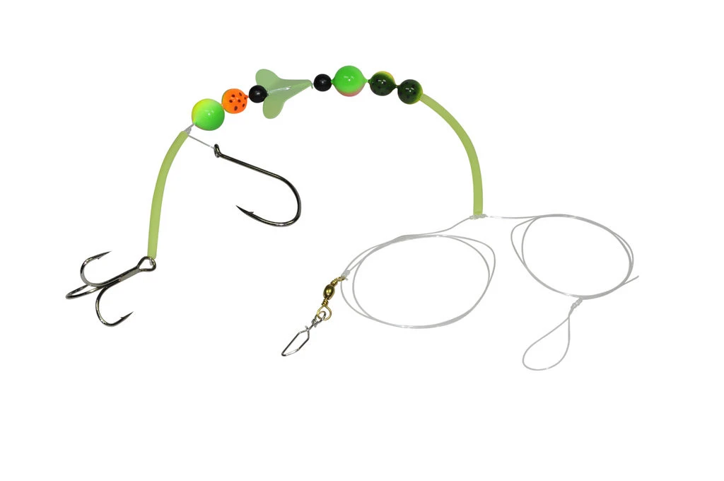 Dieses Heilbutt-System hat eine Länge von 200cm. Die Seitenarmmontage ist auf einer 0,8mm starken Schnur montiert, die eine Metallturbine und farbige Auftriebsperlen besitzt. Neben diesen hochwertigen Komponenten kommt ein VMC Perma-Steel Drilling und Einzelhaken der Größe 10/0 zum Einsatz. Ergänzt wird das Ganze durch einen starken Wirbel der Größe 3/0.