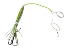 Dieses Spezial-System baut Enrico Wyrwa auf Hitra, um die ganz großen Leng an den Haken zu bekommen. Extra starke Materialien, eine Schnurverbindung ohne Knoten – in einem Stück. Die 1,20mm starke monofile Schnur ist doppelt gebunden und wird von dem Leucht-Schutz-Schlauch geschützt. Sicherer gehts nicht! Es wird ein Köderfisch auf den beiden Haken montiert. Das System wird mit einem (Leucht-) Blei (nicht mit enthalten) dem Leng „an der Nase herumgeführt“. Der Eizelhaken hat die Größe 10/0 und der Drilling die Größe 8/0. Es gibt sechs verschiedene Farben und zwei unterschiedliche Oktopusse als B2 mit 10cm (loom+pink) und Hogy Oktopusse der Größe 20cm (alle anderen Farben). Am Ende des Vorfaches befindet sich noch ein starker Sicherheitswirbel der Größe 3/0. Aus produktionstechnischen Gründen kann es vorkommen, dass die Farben der Oktopusse leicht abweichen bzw. sich ändern.