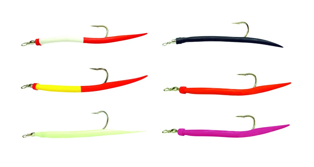 Diese originalen Gummimakks sind mit stabilen Makk-Haken ausgestattet. Der Leuchtschlauch überzieht diesen gebogenen Haken und ist mit einem Karabiner-Wirbel bestückt. Dieser Köder ist eine perfekte Sandaal-Imitation. Es gibt sechs verschiedene, fängige Farben, die in den Größen 6/0, 8/0 und 12/0 verfügbar sind. In jeder Packung sind 3 Stück enthalten.