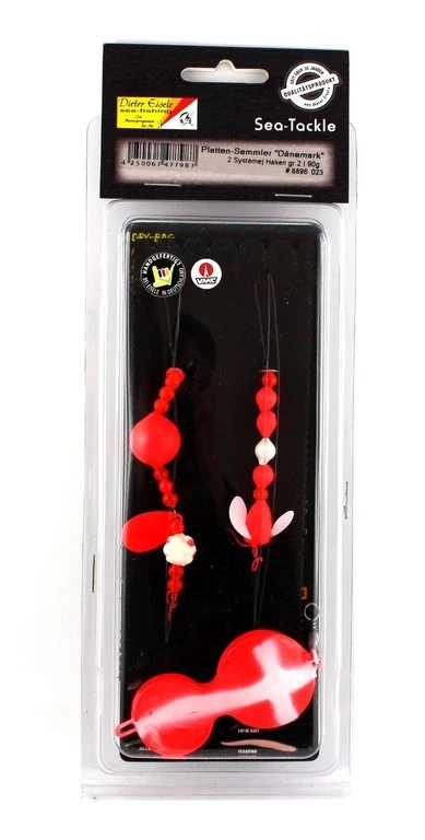 Dieses Buttlöffel-System im Dänemark-Look ist für die Angelei auf Plattfische in Dänemark konzipiert. Es besitzt einen 90g Buttlöffel mit Dänemarklackierung, zwei Haken der Größe 2, einem Spinnerblatt, Turbinen und Auftriebs-Perlen. Dieses in Deutschland handgefertigte und mit hochwertigen Einzelkomponenten geknüpfte Plattfischvorfach ist das ideale Vorfach, wenn es auf den Zielfisch gehen soll.
