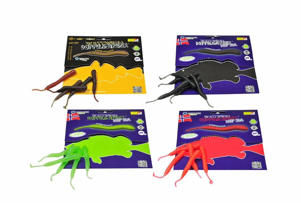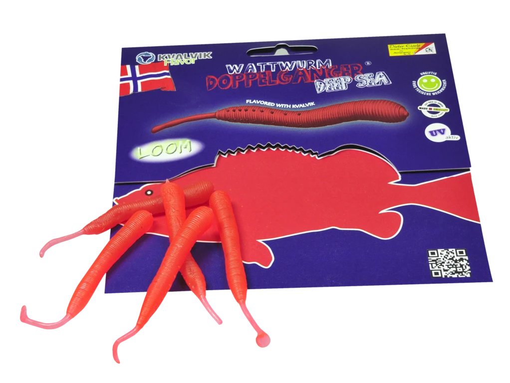 Wer kennt das nicht der Angeltag läuft und die Fische beißen. Es kommt die Zeit, wo dei vorhandenen Wattwürmer alle sind oder diese schlecht erhältlich sind. Für diesen Fall hat Eisele den Wattwurm Doppelgänger entwickelt. Dieser Köder setzt neue Maßstäbe im Kunstköderbereich. Dieser innovative Wurm sieht nicht nur aus wie ein echter WAttwurm, sondern ist auch mit dem revolutionärem Lockstoff der Norwegischen Berufsfischer „Kvalvik“ vollgesogen. Diese Würmer bestehen aus sehr haltbaren, leicht auftreibenden, PVC und phthalatfreien, nicht abfärbenden Material ohne toxische Weichmacher. Der Köder ist 1000 mal haltbarer als andere Gummiköder. Er hat eine Länge von 8cm. In jeder Packung sind 4 Watties und 1 Turbo-Tail enthalten. Die Größe dieser Wattwurm Doppelgänger gibt es in vier Farben, wobei drei (Deep Sea) speziell für die Angelei auf Rotbarsch, Steinbeißer oder auch Dorsch und Seelachs gedacht sind. Diese drei Farbvarianten leuchten extra im Dunkeln. Der Wuttwurm Doppelgänger ist Made in Germany und eine echte Alternative für das Original in Ost- und Nordsee, sowie für Norwegen und Island.