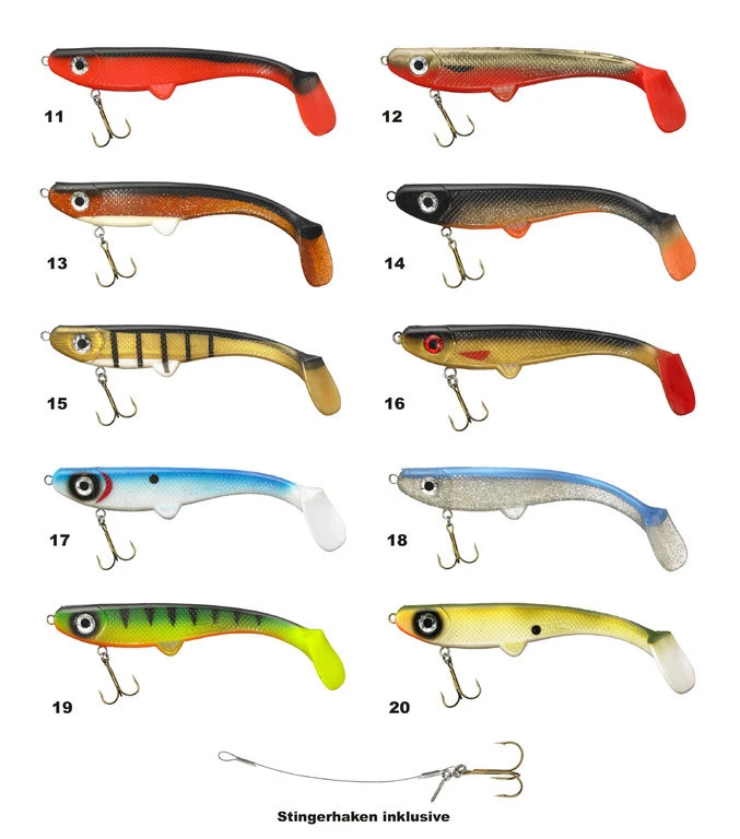 Dieser Gummifisch kommt ohne extra Bebleiung daher. Er wiegt 105g und besitzt einen Bauch-Drilling der Größe 2/0. Ein zusätzlicher Stingerhaken liegt der Verpackung bei und kann mit einem kleinen Haken am Bauch oder Rücken montiert werden. Beide Qualitäts-Haken sind superscharf.