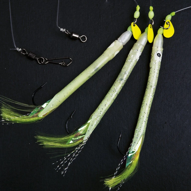 Dieses Vorfach wird in unterschiedlichen Größen angeboten. Es besitzt 3 Haken. Die Hakengröße reicht von 1/0 – 12/0. Vor jedem Haken ist ein separates Spinnerblatt montiert. Die Haken besitzen Federn und Leuchtschlach. Die Länge des Vorfaches beträgt 110cm und hat einen Durchmesser je nach Hakengröße von 0,50mm – 0,80mm. Dieses Vorfach ist ideal für Dorsch und Köhler geeignet, aber auch Makrelen lieben es. Durch die unterschiedlichen Größen können Sie es individuell an die unterschiedlichen Bedingungen anpassen.