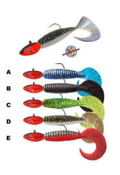 Dieser Jigkopf als Fischkopfimitat mit roten Augen und Kiemen ist in zwei Hakengrößen verfügbar. Die Gewichte reichen von 40g bis 140g.
