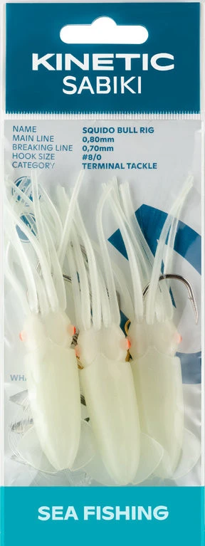 Die Zahl der Tintenfische nimmt rapide zu, und wenn die Fische ihre Ernährung anpassen – da sollten wir das auch tun. Mit Scuido Bull können Sie Tintenfischfresser in allen Größen fangen. Die Länge beträgt 115cm bei einem Durchmesser von 0,80mm (Hauptschnur). Die Haken haben eine Größe von 8/0.