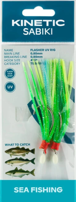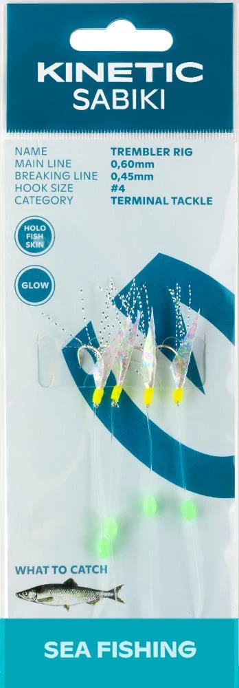 Kinetic Sabikis Trembler Holographic Fischhaut mit Flash-Fibern ist das perfekte Vorfach für alle, die auf Hering, Makrele oder andere kleinmäulige Fische in seichtem Wasser aus sind.