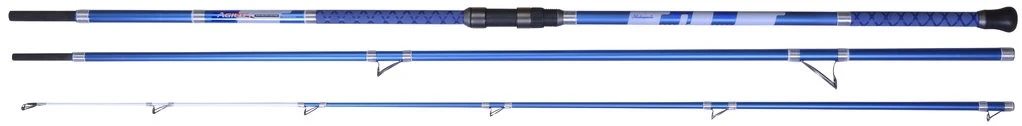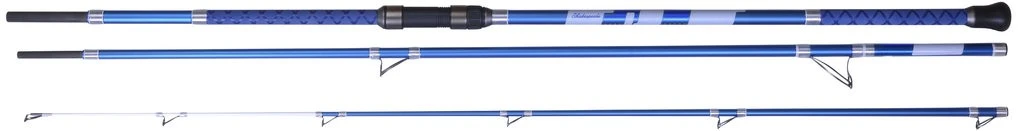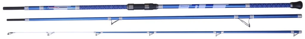 Sehr schöne 3-teilige Brandungsrute in blau mit einem Wurfgewicht von 120-250g. Die Ruten bieten sowohl gute Wurfeigenschaften als auch eine hervorragende Bisserkennung. Die Ruten haben einen dünnen Durchmesser und sind sehr leicht. Alle Surf-Ruten dieser Serie besitzen Zirkonium Oxide Ringe, einen schlanken Carbon Blank, eingespließte weiße Glasfaser-Spitze, einen neu entwickelten Schiebe-Rollenhalter und Rubber-Shrink-Wrap an den Griffen und wichtigen Schlüsselteilen. Verfügbar sind diese Ruten mit einer Länge von 3,90m, 4,20m und 4,50m.
