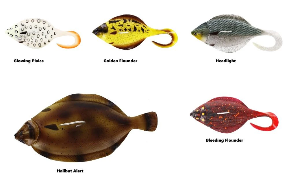 Diese Gummifisch in Form eines kleinen Plattfisches ist der ideale Köder für Heilbutt und Großdorsch. Es gibt diesen Köder in verschiedenen Farben. Die Gummifische haben eine Länge von 24,5cm und ein Gewicht von 400g.
