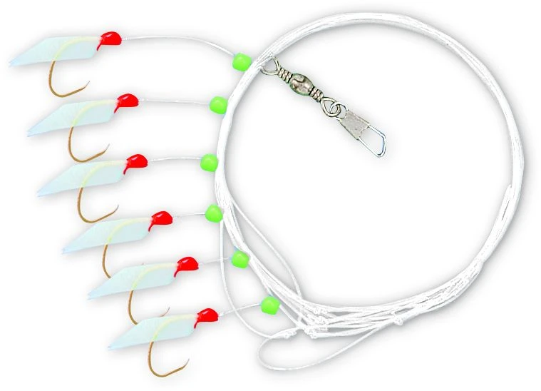 Das Vorfach besteht aus 6 goldenen Haken der Größe 7. Die Haken sind mit Fischhaut verziert vor denen eine Leuchtperle sitzt. Das Vorfach besteht aus 0,40mm starker Hauptschnur. Dieses Vorfach fängt auch bei dunklem Wetter.