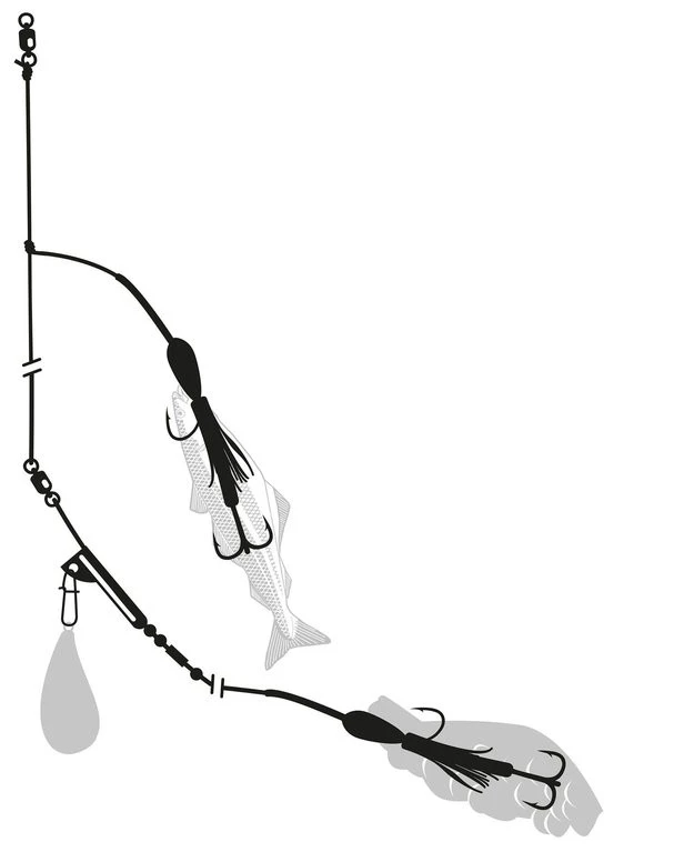 Dieses Lumb-Vorfach besteht aus 2 Einzelhaken der Größe 7/0 und zwei Drillingen der Größe 2/0 für einen Fischfetzen oder ganzen Köderfisch, sowie selbstleuchtenden Komponenten wie Schlauch und Oktopus. Die Hauptschnur hat ein Stärke von 1,20mm mit einer Tragkraft von 65Kg. Die Gesamtlänge beträgt 280cm. Das Vorfach ist ideal für das Bootsangeln auf Leng, Lump und Großdorsch. Die Lieferung erfolgt auf einem runden Aufwickler.