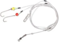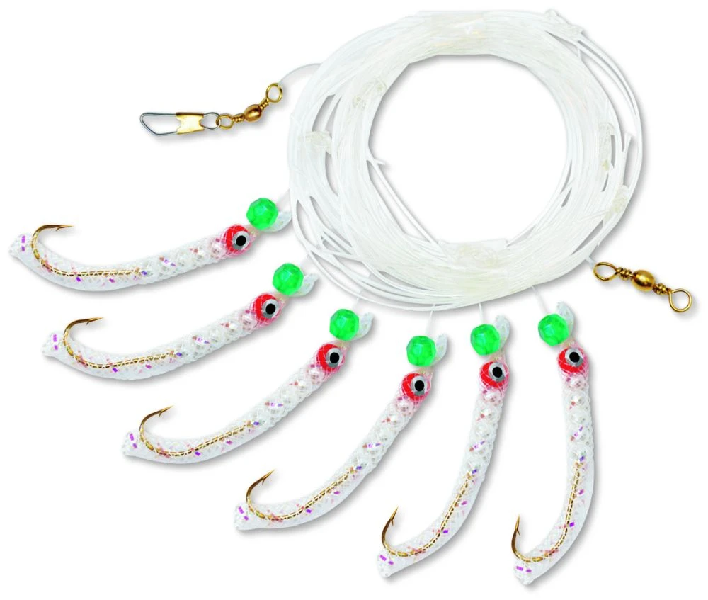 Das Vorfach besitzt sechs Beifänger, die aussehen wie Würmer, diese sind an den sechs Haken der Größe 1/0 montiert. Diesen sind Leuchtperlen vorgeschaltet.